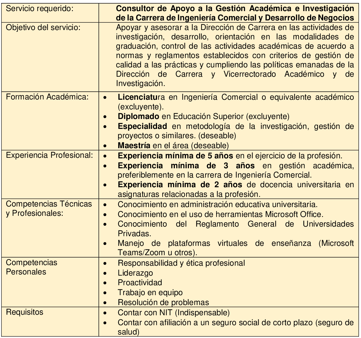 Consultor de Apoyo a la Gestión Académica e Investigación de la Carrera de Ingeniería Comercial y Desarrollo de Negocios