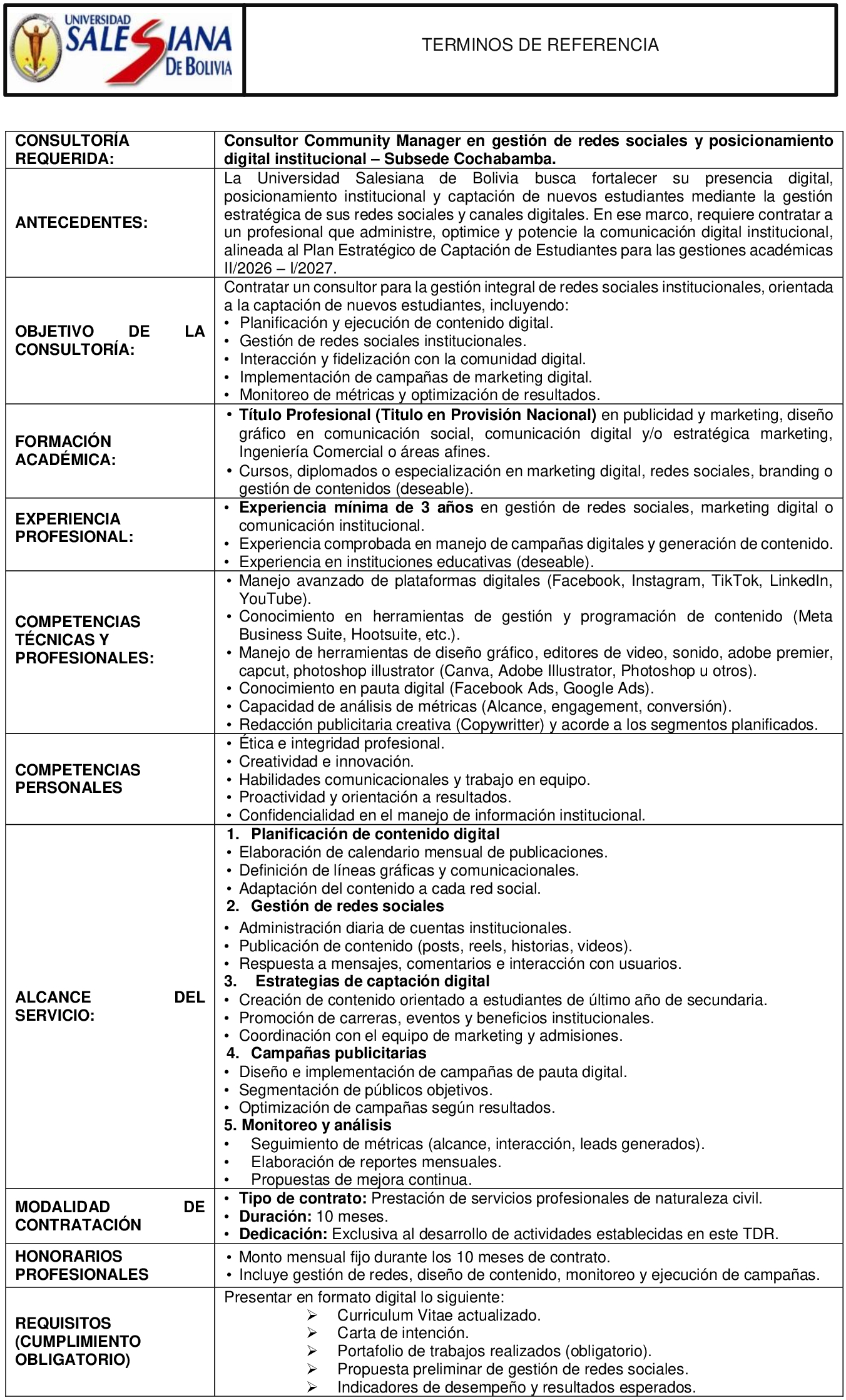 CONSULTOR COMMUNITY MANAGER EN GESTIÓN DE REDES SOCIALES Y POSICIONAMIENTO DIGITAL INSTITUCIONAL -SUBSEDE COCHABAMBA